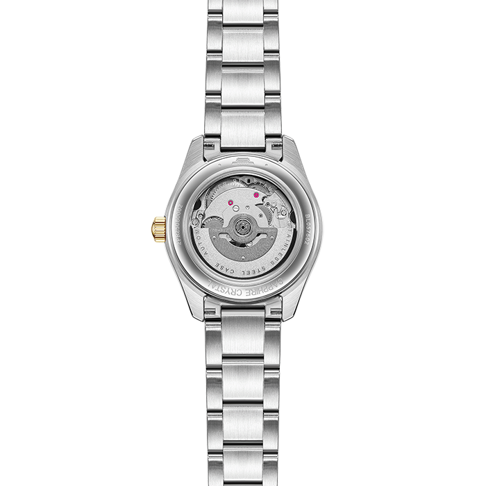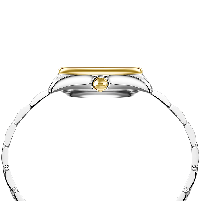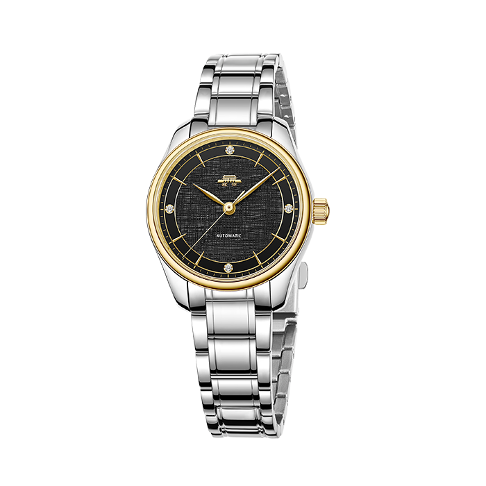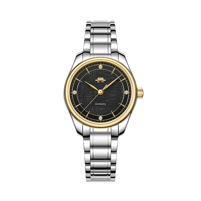 黑色布纹表盘,镶嵌4颗仿水晶;透视底盖