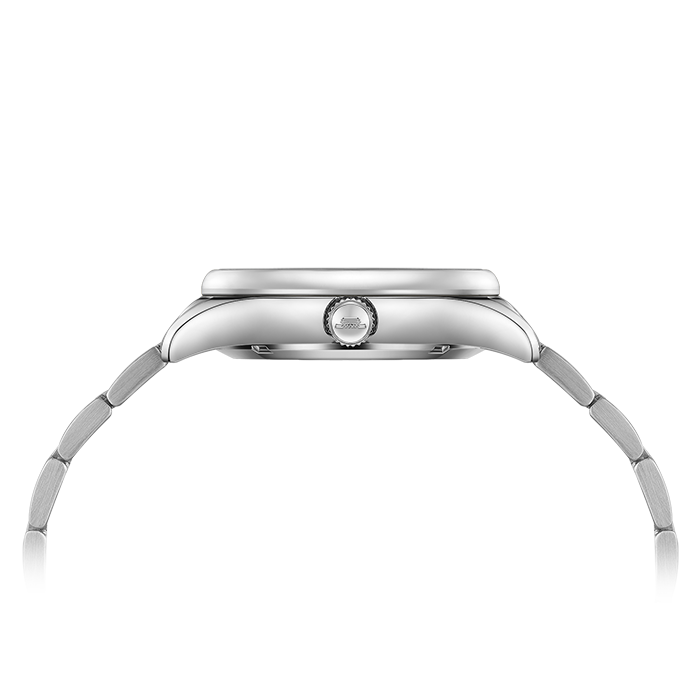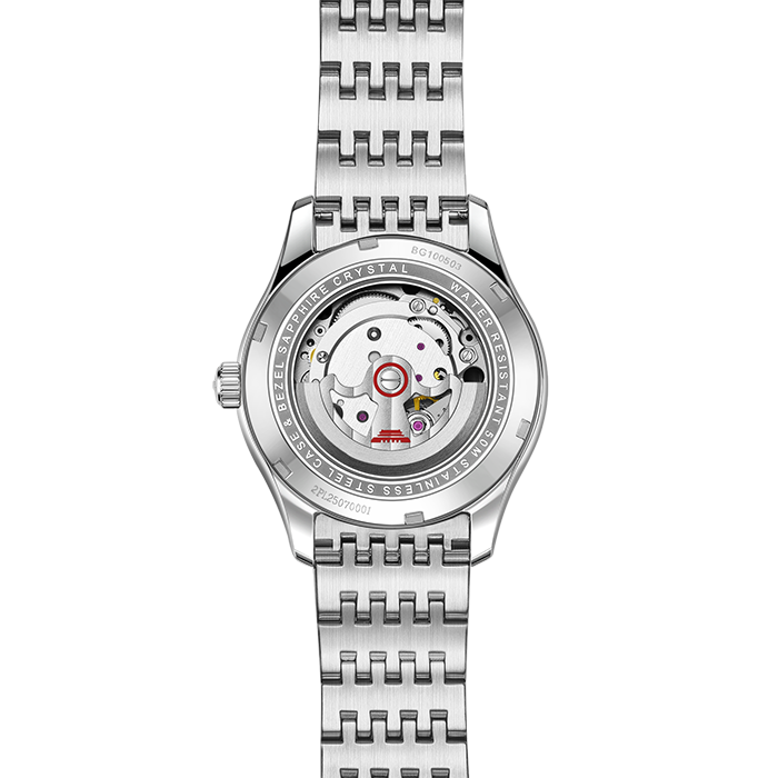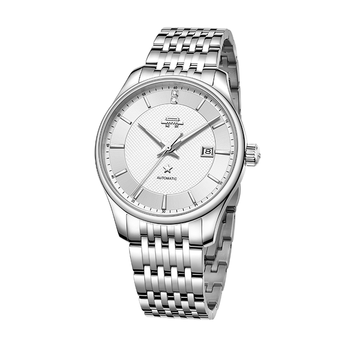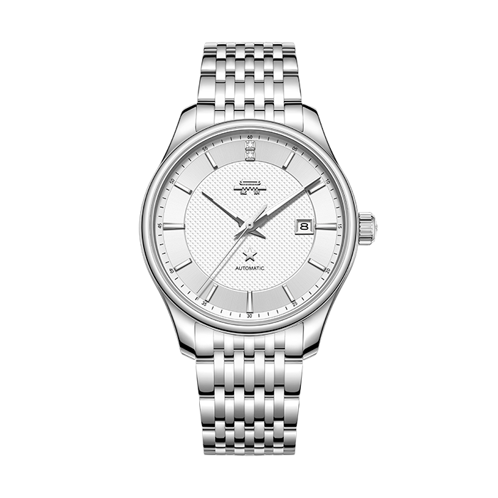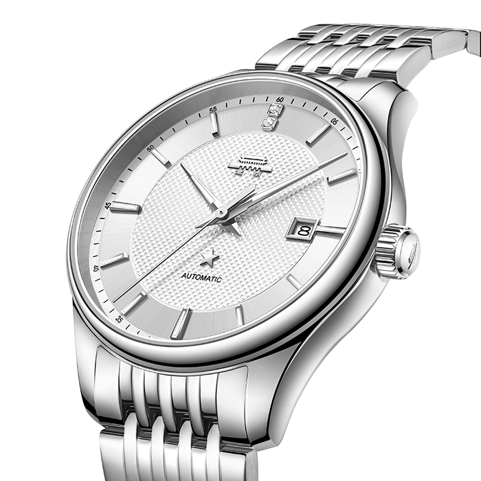银白色表盘,镶嵌夜光时符,12点位仿水晶,3点位日历窗,透视底盖