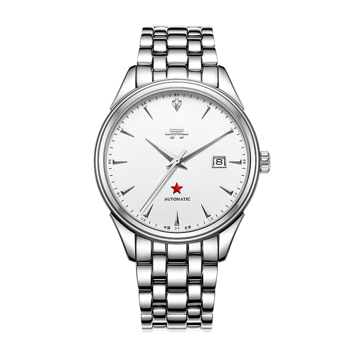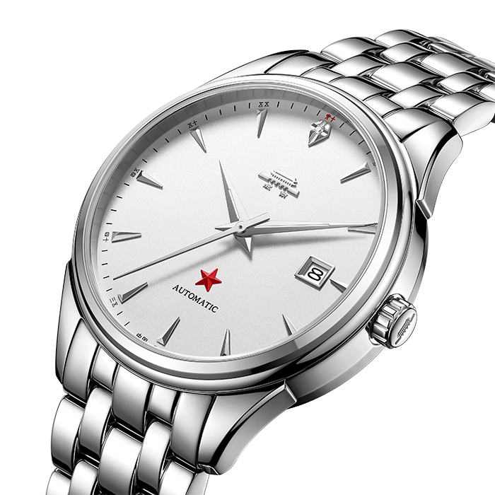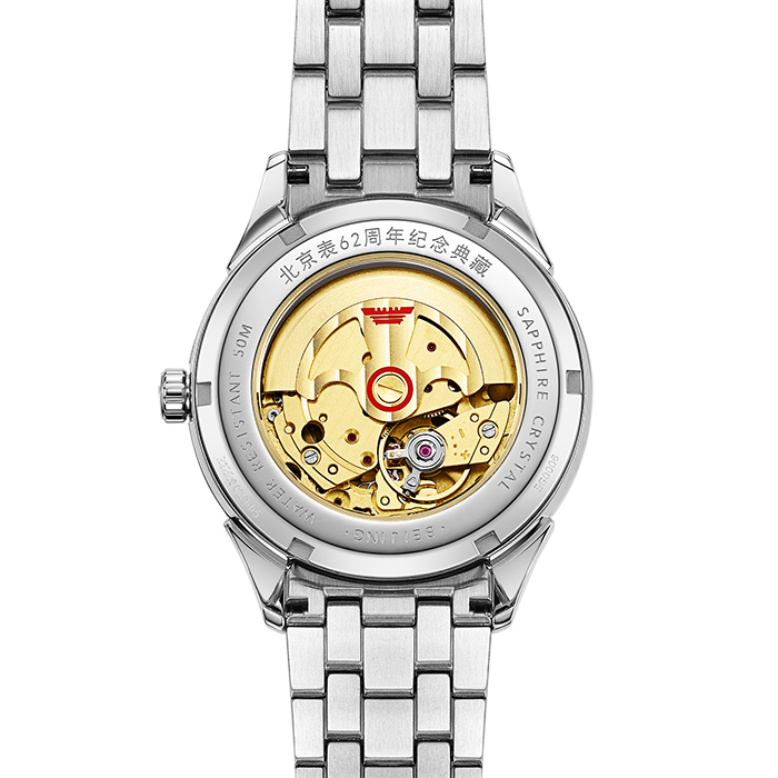 银白色表盘,12点位镶嵌1颗真钻,6点位红五星;透视底盖